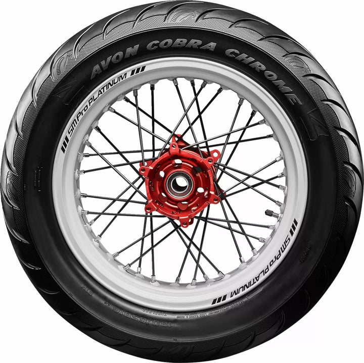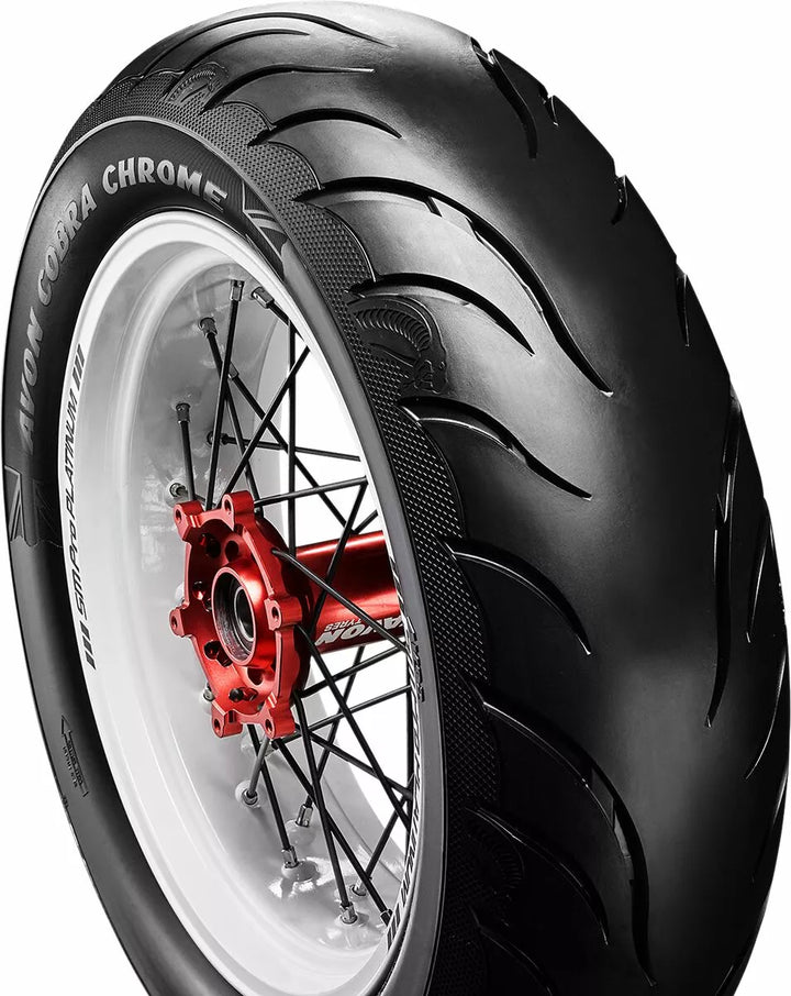 Avon's Latest Tech Pattern and Advanced Construction Produces Over A 5% Larger Footprint Compared To Avon Cobra, High Stability In All Conditions Deliveness Precise Feel and Tire Feedback, Better Traction and Shorter Stopping Distances, Even in the Wet, Incorporates Sports Tirive Longevity-Perfect for Touring, Unique Tire Design with Detaileled Aesthetic Features, Improved Tire Life Over ITS Precessor, Snakeskin-Effect Treat, Reinforced, Aimed at the Power Cruiser / Touring / Custom Market.