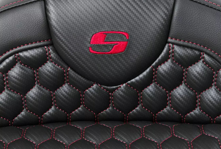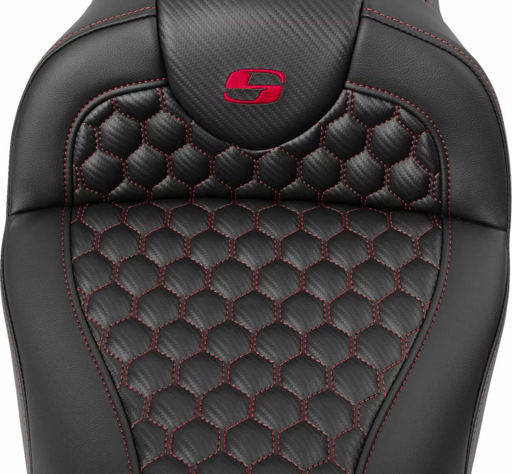 Each Seat Combines a Gel-Core ル Interior and Pro-Foam ル To Create A Foam With A Balance of Compression and Resilience Gear Long Distance Comfort, Pro-Foam ル Unique Molding Process Creates, See Elevae Resistant, Self- Durability as well as Comfort, Honeycomb (HC) Pattern Incorporates Modern Geometry In A Stylish Seat Cover, Saddlegel ル In Front and Real Reduces Tailbone Pressure and Increases Circulation and Comfort for Both Driver and Passager, conçu et fabriqué aux États-Unis