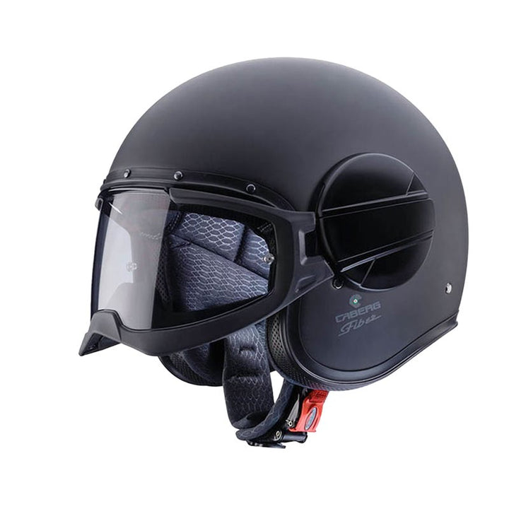 Caberg Ghost X öppen MC-hjälm i matt svart med uppfällt visir och vadderad insida för extra komfort.