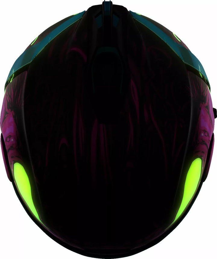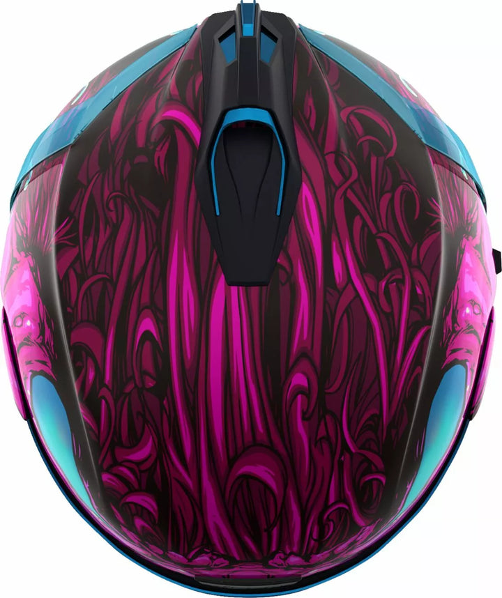 Système de ventilation continue, bouclier Icon Optics ™ sans pédé avec système à libération rapide, coquille de polycarbonate moulé par injection pour la résistance, géométrie du débit d'air interne, rôti de cou sculpté, Switsch Proock Ligne de mèche, les poches internes de haut-parleurs travaillent avec R.A.U. d'Icon. Dispositif Bluetooth, comprend Dark Smoke DropShield ™ et Rubatone Black SpeedFin ™