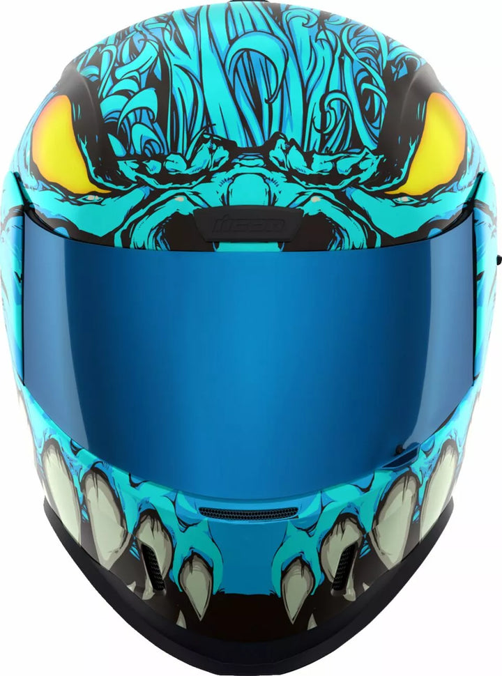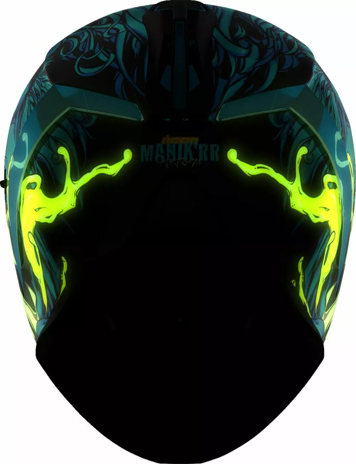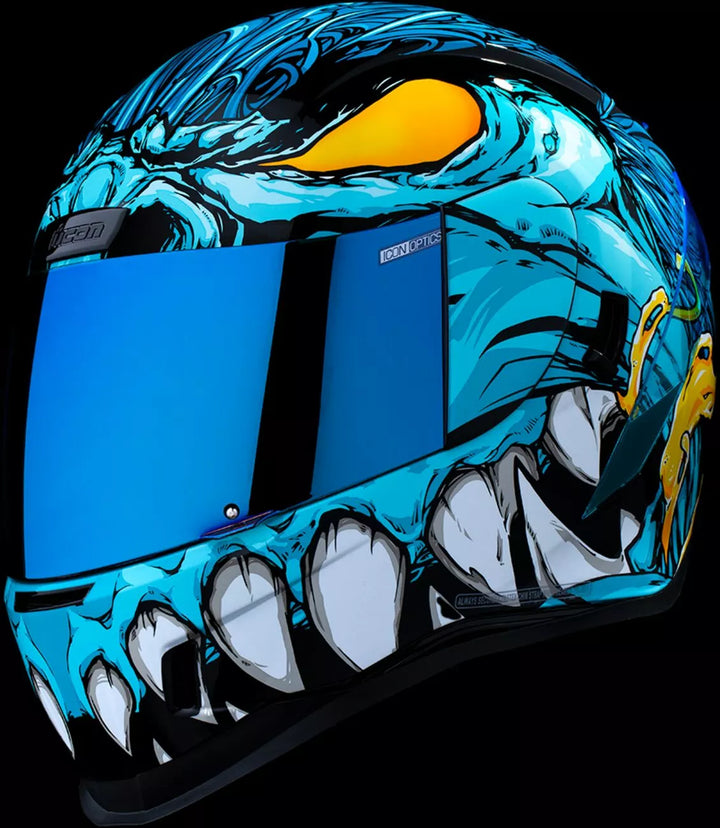 Système de ventilation continue, bouclier Icon Optics ™ sans pédé avec système à libération rapide, coquille de polycarbonate moulé par injection pour la résistance, géométrie du débit d'air interne, rôti de cou sculpté, Switsch Proock Ligne de mèche, les poches internes de haut-parleurs travaillent avec R.A.U. d'Icon. Dispositif Bluetooth, comprend Dark Smoke DropShield ™ et Rubatone Black SpeedFin ™