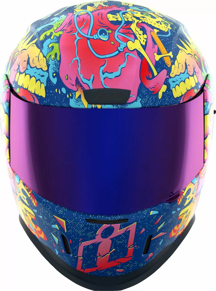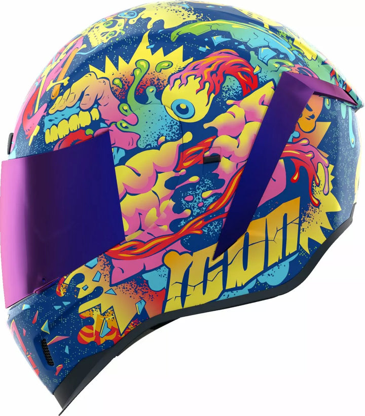 Coquille de polycarbonate moulé par injection pour la résistance, la géométrie interne du débit d'air, le système de ventilation continue, le rouleau de cou sculpeed, le système d'écriture Posiy Shield ™, le système d'écriture interne à haut rendement interne, ne doit être utilisé que tandis que le bouclier principal principal est en position d'hydratage entièrement fermé, la chute de section a-tarou La doublure, les poches internes de haut-parleurs travaillent avec R.A.U. d'Icon. Le dispositif Bluetooth, comprend Dark Smoke Dropshield, comprend Clear & RST Purple Optics Shield ™