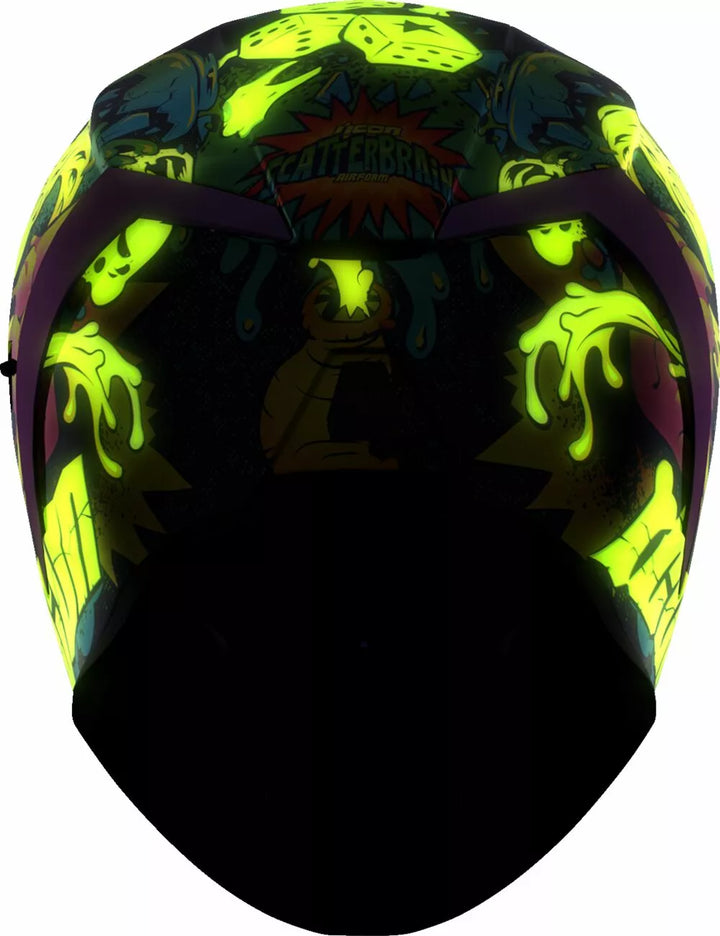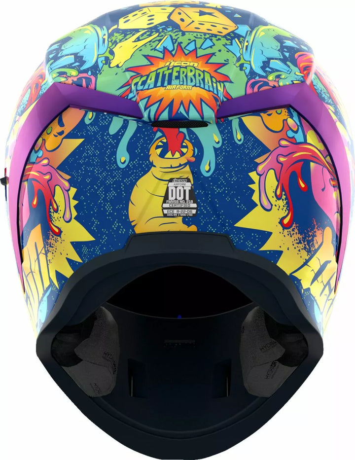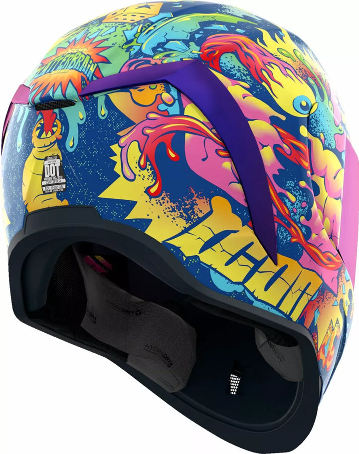 Coquille de polycarbonate moulé par injection pour la résistance, la géométrie interne du débit d'air, le système de ventilation continue, le rouleau de cou sculpeed, le système d'écriture Posiy Shield ™, le système d'écriture interne à haut rendement interne, ne doit être utilisé que tandis que le bouclier principal principal est en position d'hydratage entièrement fermé, la chute de section a-tarou La doublure, les poches internes de haut-parleurs travaillent avec R.A.U. d'Icon. Le dispositif Bluetooth, comprend Dark Smoke Dropshield, comprend Clear & RST Purple Optics Shield ™