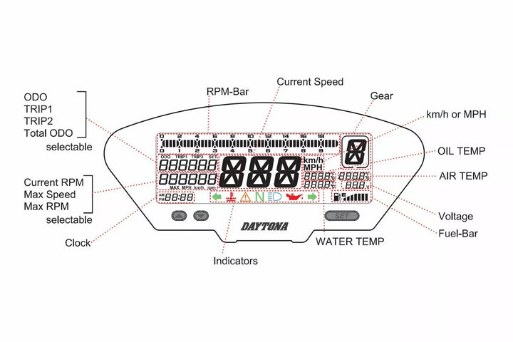 Bracket étanche (IP67), boîtier en acier inoxydable inclus, boîtier ABS noir, Speedomet, mph (0-250 mph) et km / h (0-399 km / h) sélectionnable, compteur, horloge, avertissement de batterie faible, marqué par e-mail