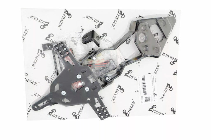 Le support de plaque d'immatriculation est extrêmement durable et à l'épreuve des intempéries., Black Powder enduit. , Le support de plaque d'immatriculation peut être utilisé pour tout type de plaque d'immatriculation (largeur de 175 mm)., Aucune modification du carénage requise., Réglage sans étape de l'angle de râteau., Prise en charge de l'indicateur réglable en 3 positions. Plaque., Supports d'éclairage indicateur spécial (vendus séparément) requis pour les voyants d'indicateur de stock., Kit comprend: 1 porte-plaque d'immatriculation incl. Kit de montage., Light Plaque d'immatriculation LED "E approuvé" incl. Support., Back Light avec support.