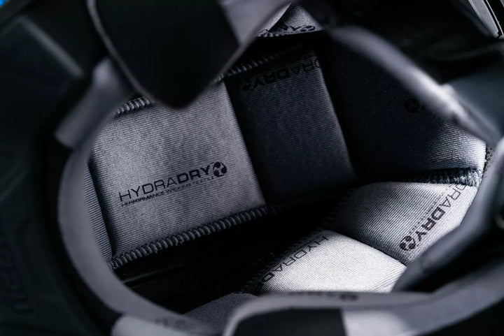 Coquille de polycarbonate moulée par injection pour la résistance, DropShield ™ sans pétillerie avec interrupteur extérieur, FLISTESHIELD ™ sans brouillard à changement rapide avec des plaques à redire, un déflecteur de respiration moulé amovible et un système de refroidissement du surestant du rideau de menton, des poches internes de haut-parleurs avec R.A.U.U. d'Icon's R.A.U. Dispositif Bluetooth, la visière DropShield ™ ne doit être utilisée que tandis que le bouclier facial principal est en position entièrement fermée, amovible Hydradry ™ Humiture Wicking Liner, comprend une fumée claire et foncée FliteShield ™