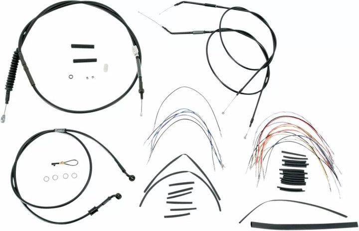 Kit d'installation complet pour les cintres de singe costaud, le kit comprend une ligne de frein étendue (sauf indication contraire), un câble d'embrayage / ligne d'embrayage prolongé, des câbles d'accélérateur / ralenti étendus comme requis et tous les câbles nécessaires, des lignes intérieures de frein, whhen inclus, felemidd, tresse extérieure, Kits de commode réutilisant la gueule de viande de stockage