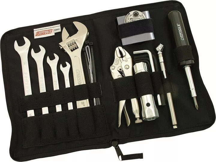 Fournit des clés combinées, une clé à réglage réglable, une pince de séchage, un tournevis 6 en 1, une clé à bouchons, une jauge de pneu, un ruban adhésif, des cravates zip Motorcycle, VTT et neige, garantie à vie - pas de quêtes non posées