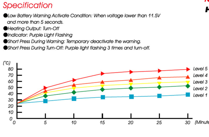 Avec Contrôle du pouce intégré et réglage de la chaleur en 5 étapes Pouvez-vous facilement changer la température sans prendre la main du conseil d'administration, qui en donne un conduite plus sûre et plus confortable. UN Affichage LED à 5 couleurs montre rapidement le mode de chauffage que vous utilisez et que Protection automatique de basse tension Assurez-vous que votre moto a toujours suffisamment de puissance pour commencer.