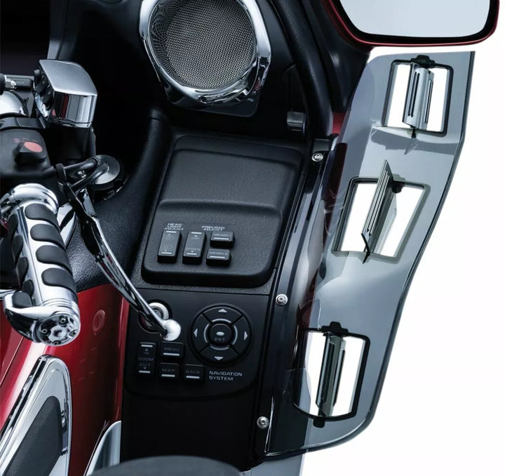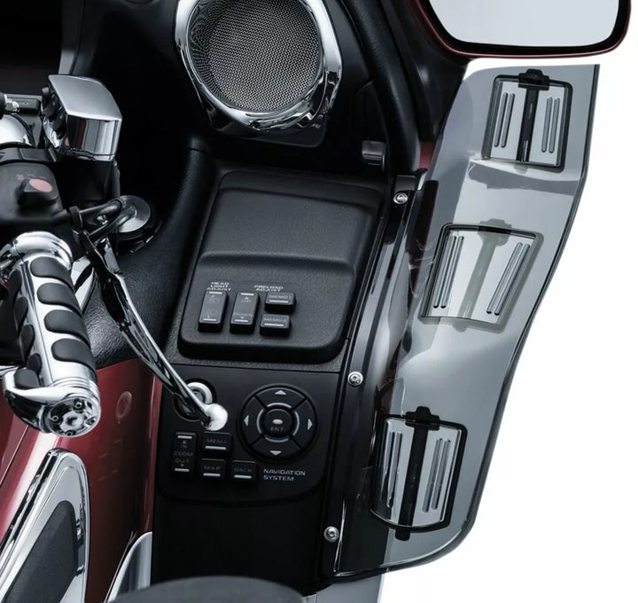 Fournit une protection complète du vent contre les miroirs tout le long des côtés du carénage, le flux d'air peut être dirigé vers ou éloigné du cavalier ou du passager avec trois déflecteurs de vent réglables par côté, le mécanisme à ressort tient en place; Facilement ajusté à la main, construction de polycarbonate à revêtement dur teinté sombre, n'utilisez pas de produits de nettoyage ou de protection à base d'ammoniac Rain-X ou à base d'ammoniac sur ce produit.