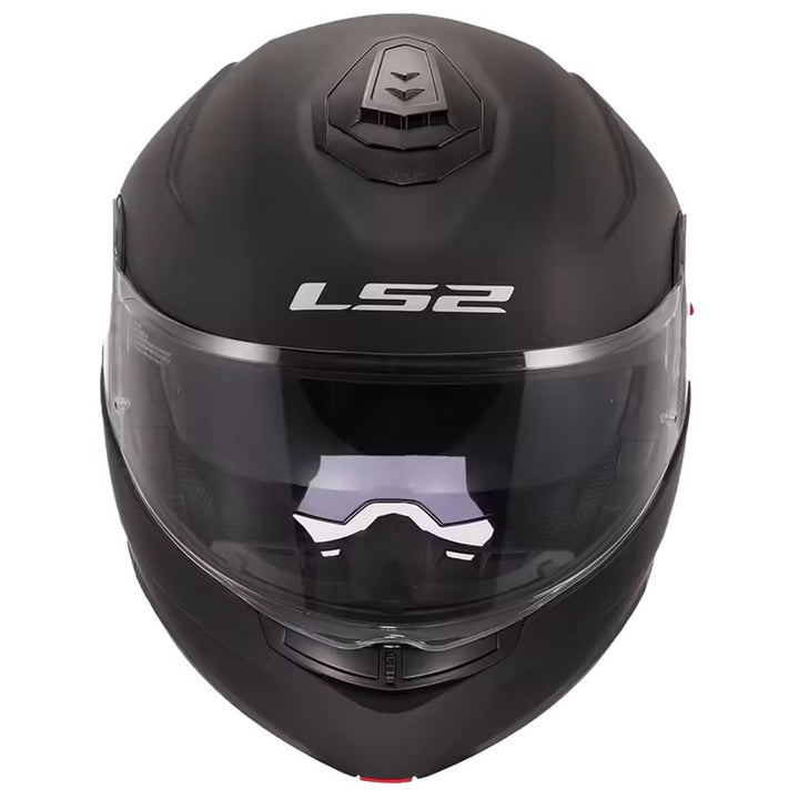 Framsidan av LS2 Öppningsbar Mc-Hjälm Strobe II Svart med klart visir och ventilationssystem. Perfekt för stadskörning och långresor.