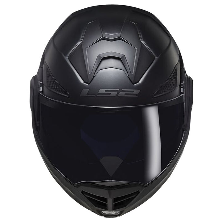 Framsida av LS2 Öppningsbar Mc-Hjälm Advant X Svart med stilren svart finish och integrerat mörkt visir.