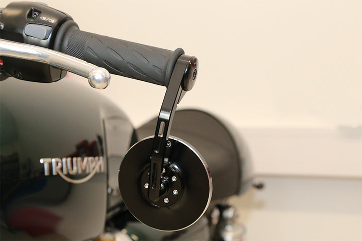 Miroir d'extrémité du guidon usiné CNC avec une tête ronde en aluminium anodisé. Avec la deuxième génération du miroir d'extrémité du guidon conlo populaire, vous pouvez choisir vous-même la méthode de montage. Soit avec les manchons de réduction fournis directement à un guidon 7/8, 1 pouce, soit au guidon disponible en option des poids d'extrémité du guidon disponibles, la courbe et le conso de type 2. Le miroir peut être utilisé à gauche et à droite.