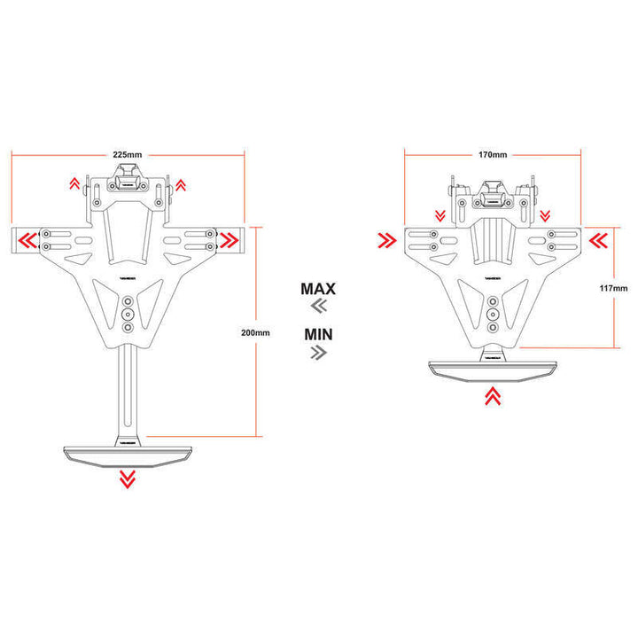 Les supports indicateurs de l'Akron-RS PRO Highsider sont réglables en largeur et avantage pour tous les types d'indicateurs accessoires. Cette option de réglage vous permet d'adapter la position de vos indicateurs à une grande variété de plaques d'immatriculation. Pour permettre aux indicateurs d'être installés sans les déconnecter du faisceau de câbles, les trous de 8 mm sont fendus sur le côté.