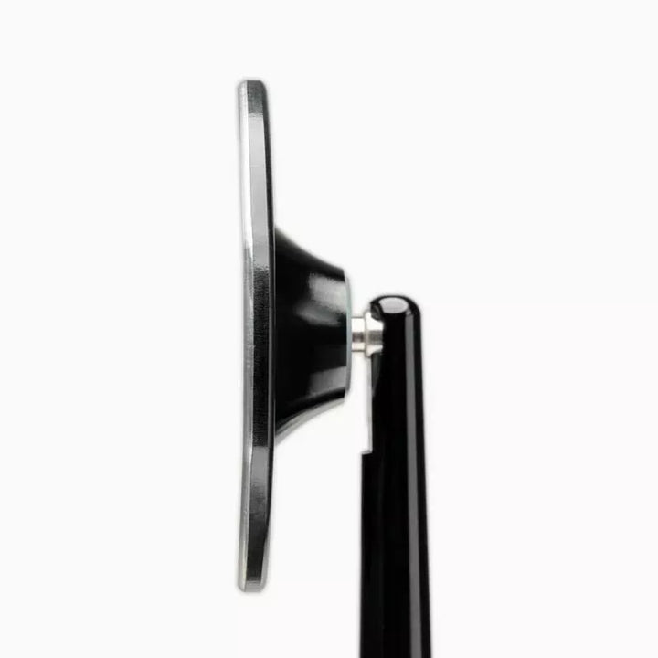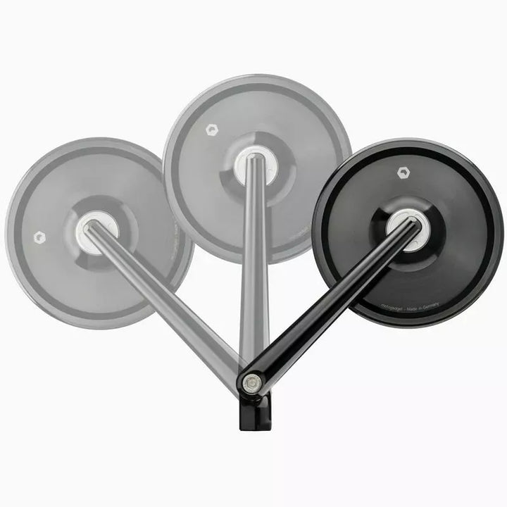 Le miroir avec un bras de miroir pivotant et des angles de verrouillage définis à 45 ° est parfait pour les passages étroits, pendant le transport ou lorsqu'il y a des problèmes d'espace dans le garage., Notre série de miroirs sans Glasles MO.View est unique dans le monde. La caractéristique spéciale de nos miroirs est la surface miroir brevetée, qui est travaillée directement à partir du métal du corps. L'aluminium lui-même est la surface du miroir., Le corps miroir lui-même est très mince et léger, créant un design en apesanteur sans bord ni cadre. La surface du miroir convexe est fabriquée par coupe de mouches à l'aide d'outils de diamant sur des machines ultra-précis à Berlin. Il est ensuite rendu résistant à l'oxydation, à la corrosion et à l'abrasion par un revêtement de plasma complexe dans un vide., Le corps miroir et le bras miroir sont fraisés en aluminium solide sur les machines CNC et anodisés à une haute qualité. Toutes les vis sont en acier inoxydable. La balle précise joigne le miroir à régler confortable et très stable. La rupture de verre ou la chute de verre n'est tout simplement pas possible., Une caractéristique spéciale des miroirs de la série Flip est le bras de miroir pivotant avec des angles de verrouillage définis à des intervalles de 45 °. Cela permet au miroir d'être incliné vers le haut comme requis sans modifier le réglage du miroir., Extrêmement pratique pour les passages étroits, les problèmes d'espace dans le garage ou pour le transport. Le mécanisme de verrouillage est très stable et ne peut pas être ajusté accidentellement. Le miroir ne vibre pas même à des vitesses élevées lorsqu'il est monté en corner., Le miroir monté sur la surface peut être installé sur n'importe quel fil de miroir M10 sur le guidon. Trois vis de fixation avec différents filetages sont fournies. Le miroir convient au côté gauche et droit, diamètre du corps du miroir: 99 mm., Épaisseur du corps du miroir sans tête de balle: 4,5 mm., Longueur du bras miroir: 110 mm., Poids: env. 300 G