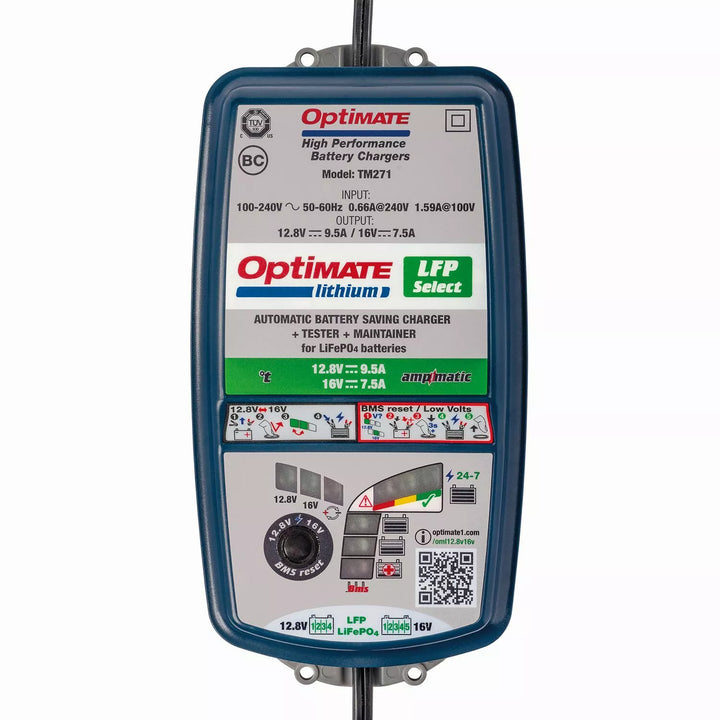 Opticate Lithium Series LFP 4S 9A / 5S 7A: 10-Step 12.8V 9.5A / 16V 7.5a Charger d'économie de batterie., Le chargeur de batterie avancé `` Pro '' pour la batterie de 12,8V et 16V LifEPO4 / LFP, dans In in In In In cas, le Chargeur Lithium ultime pour la piste! Véhicules / Craft ci-dessus., BMS: réinitialisation de l'alimentation réénergit rapidement la batterie., Chargeur SELECT 16V pour 4,8 V pour 4,8 V pour 4,8 V pour 4,8 V pour 4,8 V pour 4,8 V pour 4,8 V pour 4,8 V pour 4,8 V pour 4,8 V pour la mémoire, Mémoire, même si la puissance AC est perdue. En toute sécurité à la charge complète. Connectez-vous à la batterie et à l'optime de sélection de lithium fait le reste, aucune supervision requise!, Ampmatique: ajuste automatiquement le courant pour correspondre à la taille et à l'état de la batterie., Sécurité à quitter connecté. Protection électronique complète., 24/7: maintient la batterie à pleine charge et une bonne santé., Récupération basse tension à partir de 0,5 V Effectif 24 à 7 Entretien de la batterie et alimentation en attente inférieure à 0,5 W., IP54: résistant aux intempéries. Évalué pour une utilisation jusqu'à -40 ° C / -40 ° F.