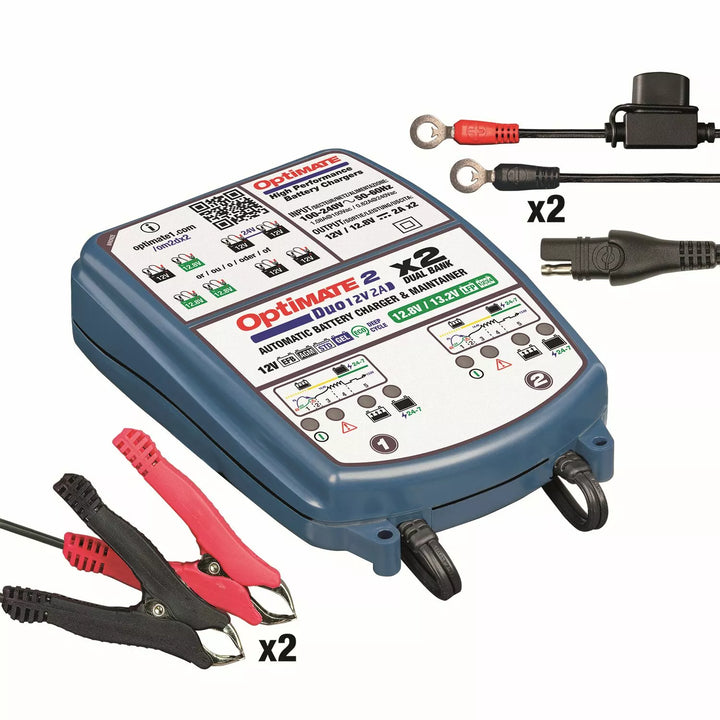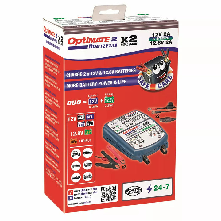 OptiCate 2 Duo x 2 Bank Bronze Series: 5-Step 12V / 12.8V 2A Scelled Batteryneer X2., Le puissant entretien de batterie à 2 banques «sans cerveau» pour la batterie haute technologie dans l'un de vos véhicules. Garantie une batterie en lithium ou en plomb-acide sain!, Idéal pour 2x 12 V-ACID et 12,8 V / 13,2 V Lithium LFP (LifePO4) Batteries., Charge, tester et maintenir les batteries de retard de plomb (STD, GEL) indépendamment. Les batteries sont toujours prêtes à fonctionner., Fournit 2 ampères Courure de charge recommandée pour l'entretien des batteries plus grandes., Frais et offrent un entretien à long terme. Connectez-vous à la batterie et OPTime 2 Duo Dual Bank fait le reste, pas de supervision requise!, Duo: s'adapte automatiquement à la batterie PB ou LFP., Sécurité à quitter Connected. Protection électronique complète., 24/7: maintient la batterie à pleine charge et une bonne santé., Démarrage en basse volt de 4V., Des dommages à la batterie d'avertissement sont détectés., Green Technology: Energy Saving Technology. Alimentation en veille inférieure à 0,5 W et entretien efficace de la batterie 24-7., IP54: résistant aux intempéries. Évalué pour une utilisation jusqu'à -40 ° C / -40 ° F.