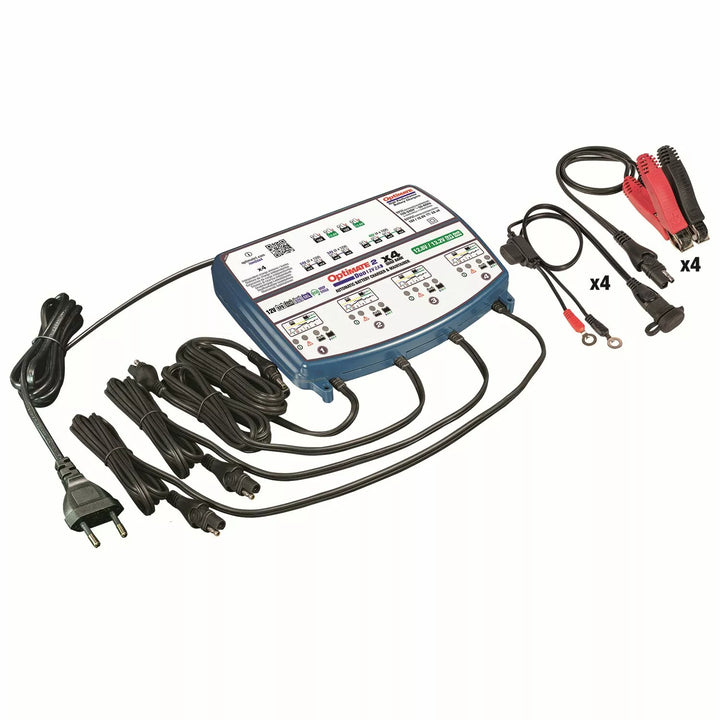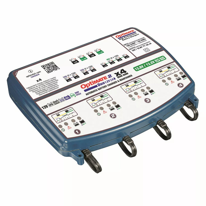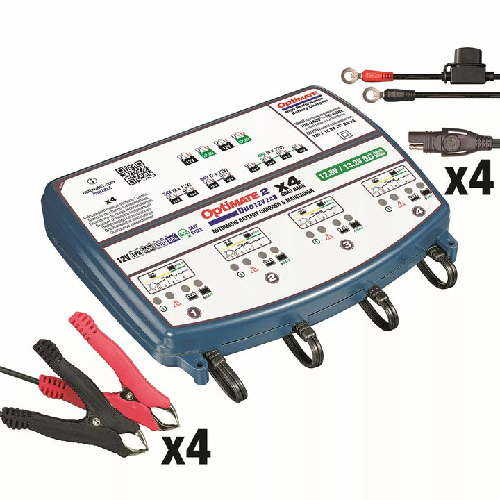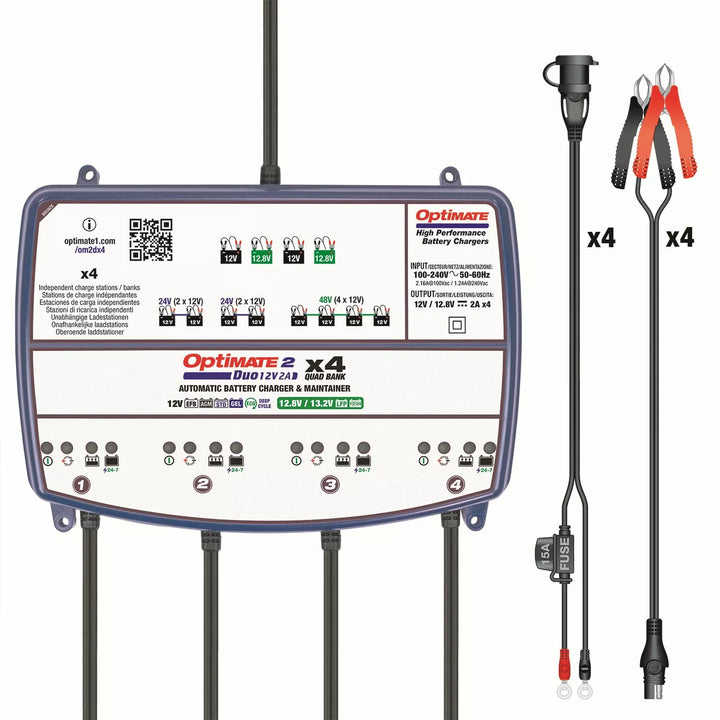 OptiCate 2 Duo x 4 Bank Bronze Series: 5-Step 12V / 12.8V 2A Scelled Batteryneer X4, le puissant `` NO Brain '' 4-Battery Masiainer pour la batterie haute technologie dans l'un de vos véhicules. Le choix du concessionnaire pour les ateliers occupés!, Idéal pour les batteries Lithium LFP 4X 12V et 12.8V / 13.2V Lithium LFP (LifePO4)., Les batteries de plomb 4 x 12V (AGA, AGA, GEL) / 13.2 sont toujours prêtes à effectuer des efforts de chargement 2 AMPS Recommandés pour le maintien de la maintenance des battages plus gros. Connectez-vous à la batterie et à l'Optime 2 Duo Quad Bank fait le reste, aucune supervision requise!, Duo: s'adapte automatiquement à la batterie PB ou LFP., Sécurité à quitter connectée. Protection électronique complète., 24/7: maintient la batterie à pleine charge et une bonne santé., Démarrage en basse volt de 4V., Des dommages à la batterie d'avertissement sont détectés., Green Technology: Energy Saving Technology. Alimentation en veille inférieure à 0,5 W et entretien efficace de la batterie 24-7., IP54: résistant aux intempéries. Évalué pour une utilisation jusqu'à -40 ° C / -40 ° F.