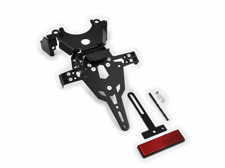Le support de plaque d'immatriculation est extrêmement durable et à l'épreuve des intempéries., Black Powder enduit. , Le support de plaque d'immatriculation peut être utilisé pour tout type de plaque d'immatriculation (largeur de 175 mm)., Aucune modification du carénage requise., Réglage sans étape de l'angle de râteau., Prise en charge de l'indicateur réglable en 3 positions. Plaque., Supports d'éclairage indicateur spécial (vendus séparément) requis pour les voyants d'indicateur de stock., Kit comprend: 1 porte-plaque d'immatriculation incl. Kit de montage., Light Plaque d'immatriculation LED "E approuvé" incl. Support., Back Light avec support.