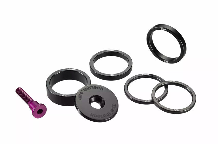 Level Up Your Ride With E*Thirteen's Top Cap & Headset Spacer Kit! , Reduce Weight and Add High-End Style While Fine-Tuning Your Cockpit. , Experience Increased Strength and Performance With Anodized Alloy Top Cap and 7075 Al Bolt. , The Lightweight, Low-Profile Alloy Top Cap Integrates Perfectly with e*Thirteen stems, but is equally at home on most stems on the market. , Bolts are brilliantly anodized in colors to match e*thirteen plus stems and other components. , T25 Hardware Means Single Tool Adjustments of Any Part of Your E*Thirteen Bar/Stem Assembly., 5 Black Anodized Alloy Headset Spacers in Multiple Sizes Allow the Ultimate Flexibility in Rise Adjustment. , Size: 34.8mm Diameter., Weight: 33G/Kit., Scope of Delivery: Top Cap, Steerer Bolt, 1x10mm, 2x5mm & 2x3mm Black Anodized Alloy Headset Spacers.
