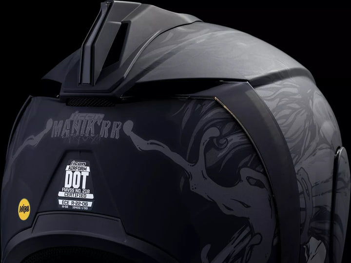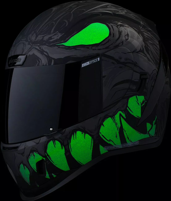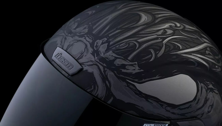 Continuous Venting System, FAG-FREE ICON OPTICS ™ Shield with Rapid-release ™ System, Injection Molded Polycarbonate Shell for Strength, Internal Airflow Geometry, Sculpted NECK Roll, Prolock ™ Switsch, the EXTERIOR WITH LOCKING SHIVING SWEQU Visor must only be used while the main face shield is in the fully closed position, removable Molded Breath Deflector, Removable Hydradry ™ 3-Piece Moisture Wicking Liner, Internal Speaker Pockets Work With Icon's R.A.U. Bluetooth Device, Includes Dark Smoke Dropshield ™ and Rubatone Black Speedfin ™
