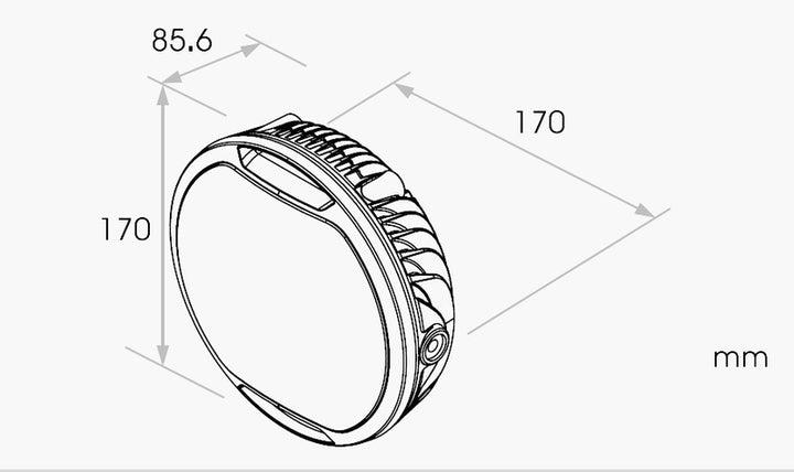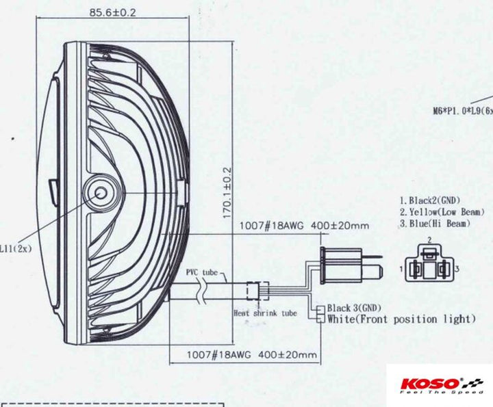 Koso Led Headlight Thunderbolt 170mm Diameter of 170mm; Depth of 86mm With GlassClamped With Two M8 Screw On Side DC 12V 15.1W On High Beam9.7w On Driving Beam4.6w On Position Lights 3 Connector: Black: GroundyELLOW: High Beamblue: Driving Beam