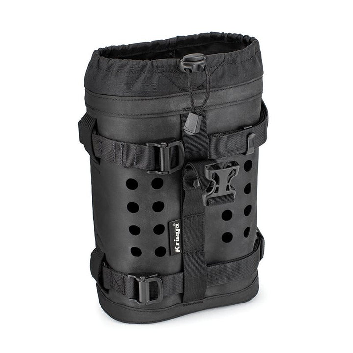 Versatile powerful ascertains that can easily be attached to Olympic panies (side bags), US Drypack or tank which provides easy access to two 1-liter fuel or beverage bottles. Maximum FL ash size is 80 mm x 280 mm. Made in very durable hypalone and provided with drawstring and compression straps. Attach hooks in fluff -classed aluminum and buckles in strong acetal and as always on Kriega's products, a full 10 year warranty is provided.