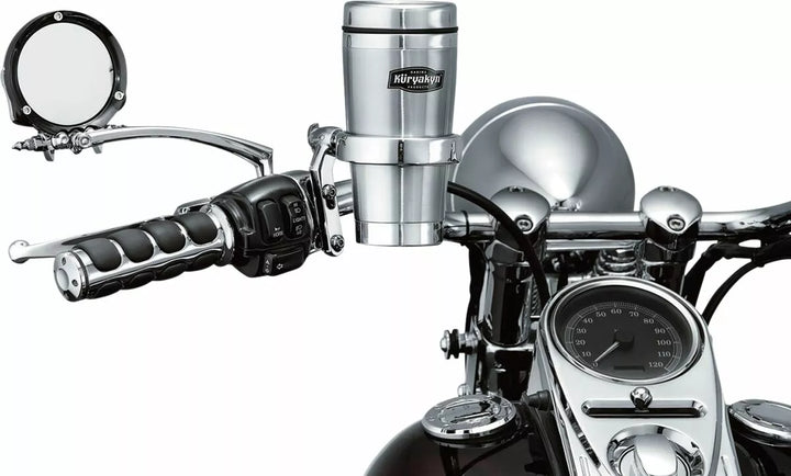 Clamps to the Handlebar or The Clutch/Brake Perch and Holds An Average-Size Cup, Can, Bottle or Mug, Quick-Detach Mount Leaves A Simple Clamp When Not In Use, CLAMP DEGENES BEVENT TO SWIVEL WHEN Needed, Stainless Steel Mug With Muge Ring