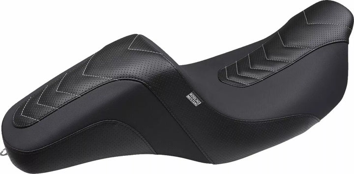 Performance-packed variation of one of the Most Popular Seat Platforms with a Unique Look, Featuring Contrasting-Color, Reverse Apex Chevron Pattern on perforated vinyl, split panel, gripper vinyl cover for stability and performance, riders are positioned Sligt. The Rider Increased Lower Back Support, Wide Tail Section Provides A Stylish Look and Ample Comfort for 2-Up Riding, Mustang's Proprietary Controlled-Density Foam Formula Requires No Break-In and Retains Shape and Support After Years of Use, Marine, Marine Durability, polyurethane bumpers to absorb vibration