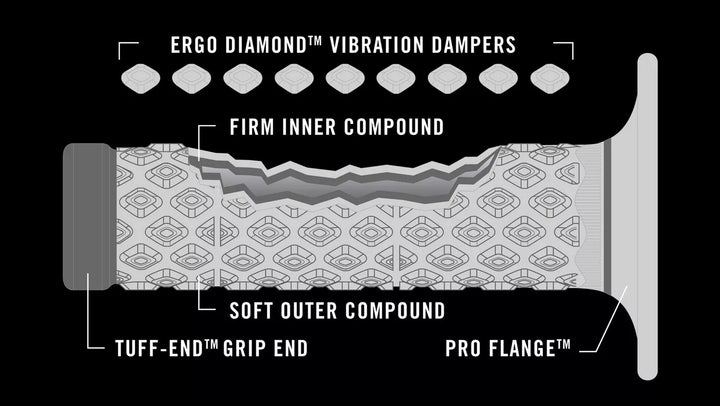 Pro Flange Created to Reduce Inboard Thumb Abrasion Based on Extensive Rider Feedback, Soft Outer Compound and Firm Inner Compound, Ergo Diamond ™ Vibration Dampers, Tuff-end ™ Grip End