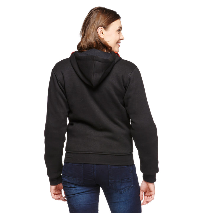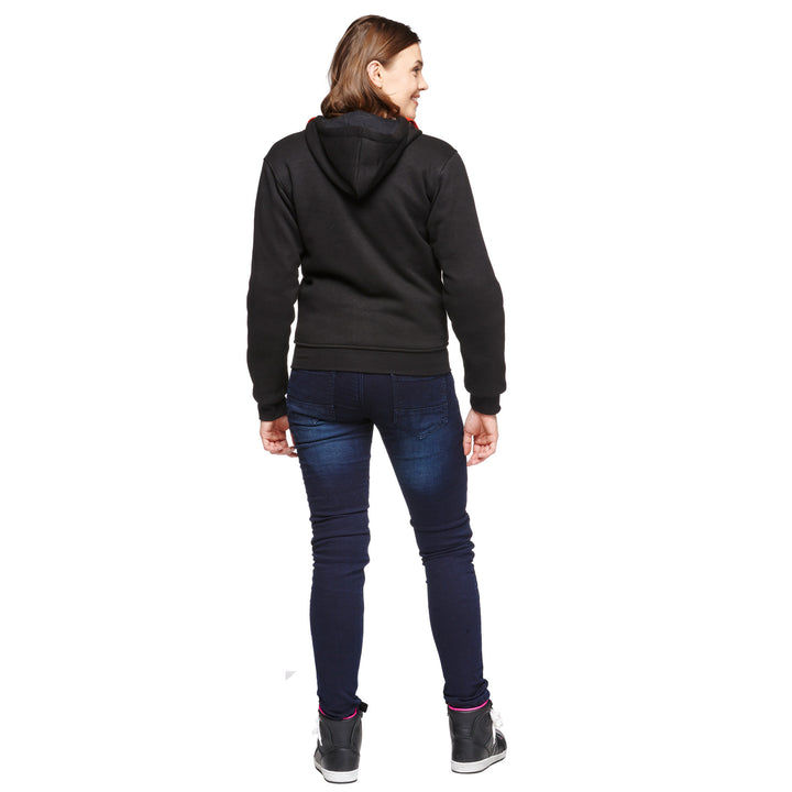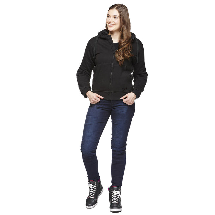 Sweep Kevlar Mc-Hoodie for ladies is a Comfortable and stylish Black motorcycle hoodie, perfect for hot days. Made of thick and soft cotton, reinforced with Aramid fibers For extra durability and safety. The hoodie has Removable CE EN1621-1-approved protection in shoulders and elbows, which effectively absorb shocks in the event of an accident.