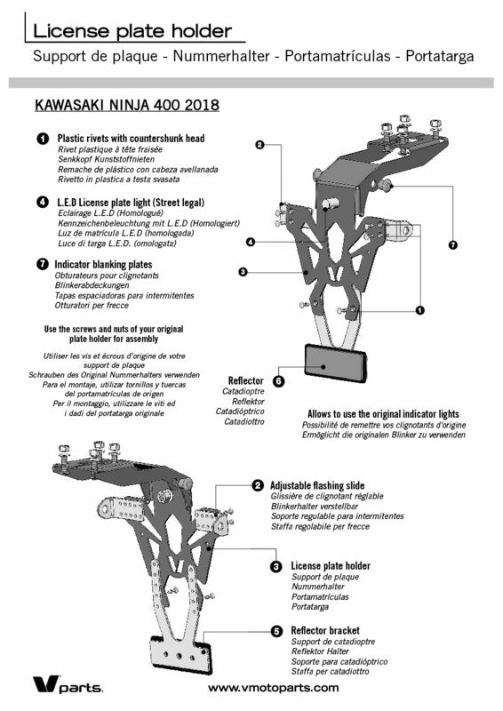 V PARTS license plate holder are manufactured in France. Inconspicuous and perfectly finished, they are specifically developed for the attached bike application list. 2mm thin but sturdy steel license plate holder Black epoxy painting CNC Manufactured – laser cut: precise finish Holes to fix license plate, indicators and license plate lighting Made in France Contents: Street legal license plate lighting, EU certified Adjustable reflector plate Reflector, EU certified More info: Optimized and discreet cable passageway Fast & easy mounting Adjustable indicators brackets Fits EU plates Indicator lights spacing: 170 to 220mm Color: Black Material: Steel