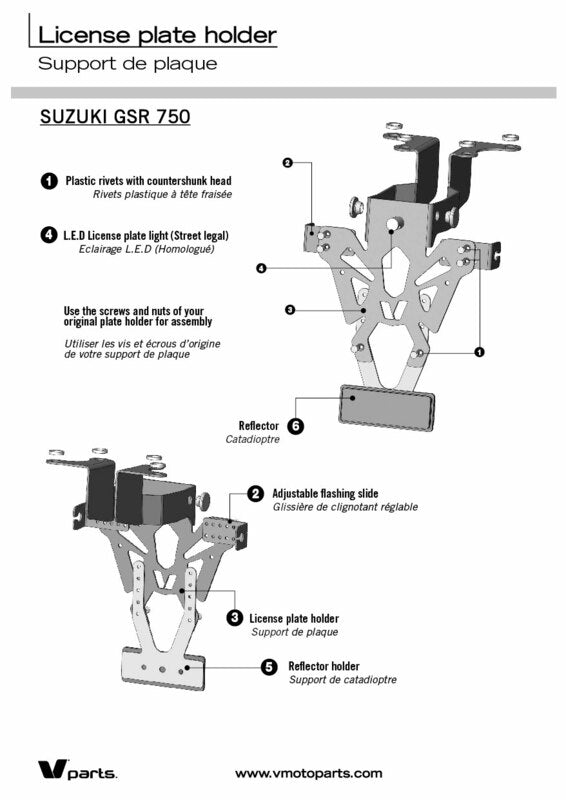 V PARTS license plate holder are manufactured in France. Inconspicuous and perfectly finished, they are specifically developed for the attached bike application list. 2mm thin but sturdy steel license plate holder Black epoxy painting CNC Manufactured – laser cut: precise finish Holes to fix license plate, indicators and license plate lighting Made in France Contents: Street legal license plate lighting, EU certified Adjustable reflector plate Reflector, EU certified More info: Optimized and discreet cable passageway Fast & easy mounting Adjustable indicators brackets Fits EU plates Indicator lights spacing: 170 to 220mm Color: Black Material: Steel