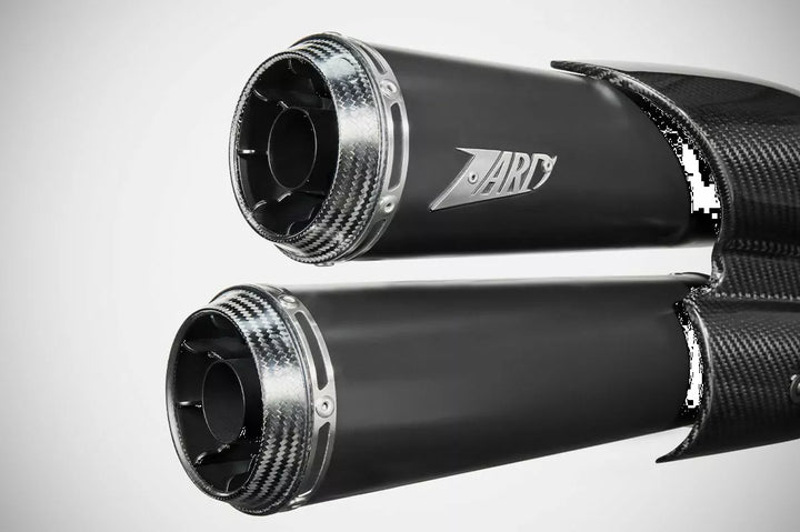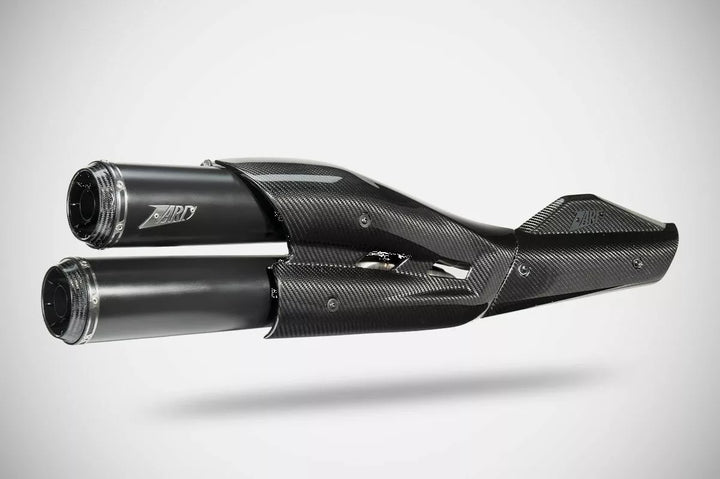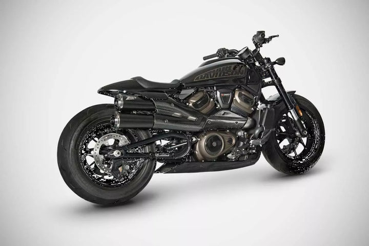 Zard Top Gun Slip-On 2: 2 Exhaust System E5, Zard Top Gun Exhaust for the Harley-Davidson ᆴ Sportster s 1250 has been designed to give a new identity to the design of this modern power cruiser., Made entire of aisi 304 stains kit of the oval and streamlined silencers, with diagonally cut, carbon fiber end caps, in addition to the refined math black cerakote ᆴ finish and the zard logo laser-engine., The zard モ gt ヤ exhaust for the harley-vids 1250 Comes with the appropriate db-guy .., to complete this exhaust system, zard has designed and manufactured an exclusive two-part carbon fiber heat shield that replaces the entire plastic unit of the original model and integrates perfectly into the bike メ s design, the result of eg.